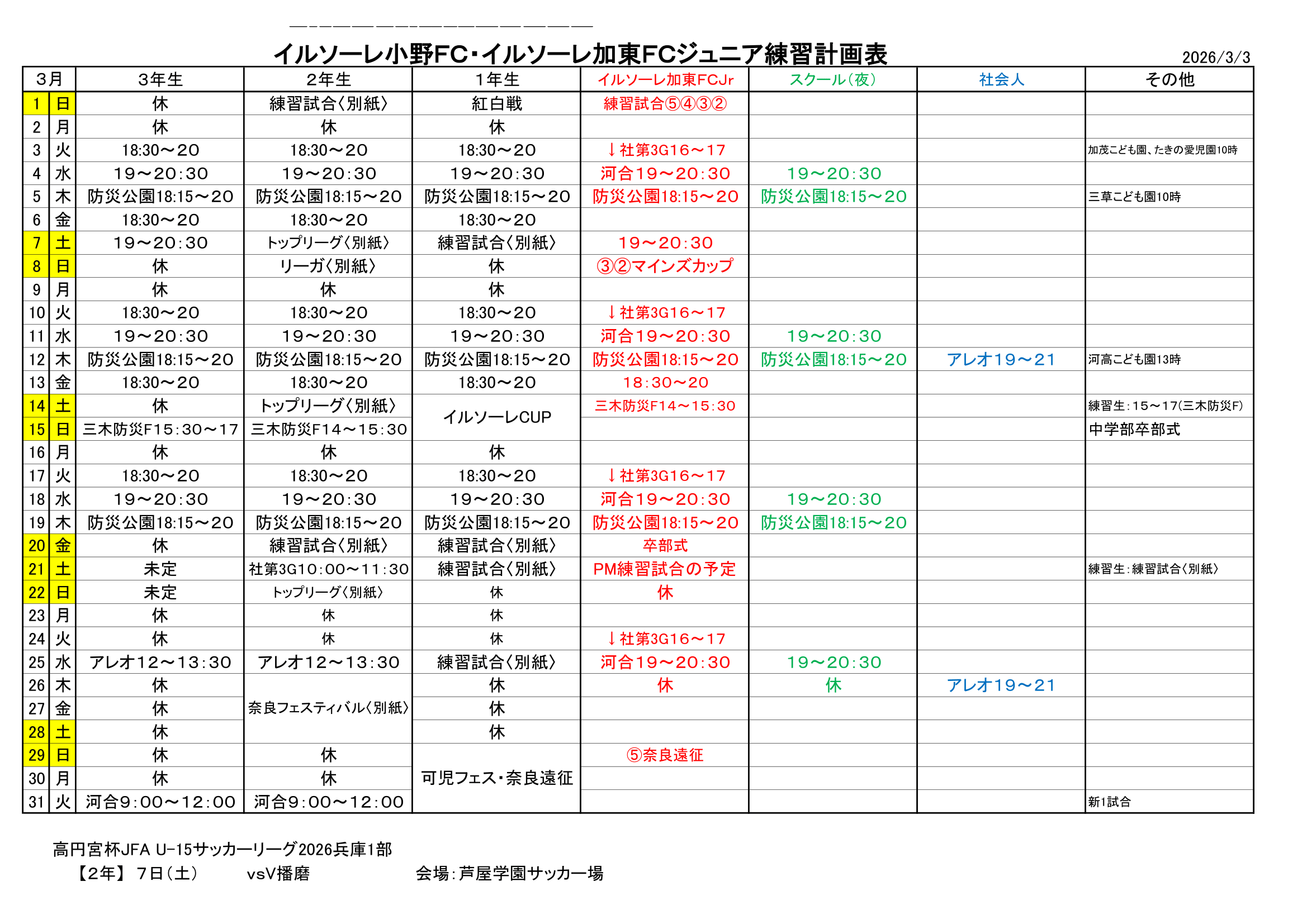 ・イルソーレ加東FC(小学生)→赤字 ・イルソーレ小野・三木・GKスクール(小学生)→緑字